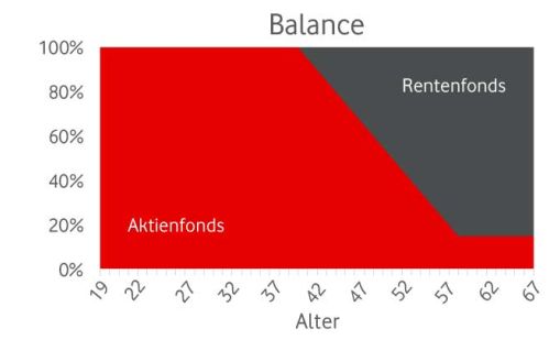 Ziel dieser Anlagestrategie ist es, eine ausgewogene Balance zwischen den Chancen und Risiken des Kapitalmarkts zu finden. In dieser Strategie spielt der Vodafone Rentenfonds eine stärkere Rolle als in „Wachstum“. Aber auch dem Vodafone Aktienfonds kommt – vor allem bei jüngeren Mitarbeitern – eine wichtige Bedeutung zu.
