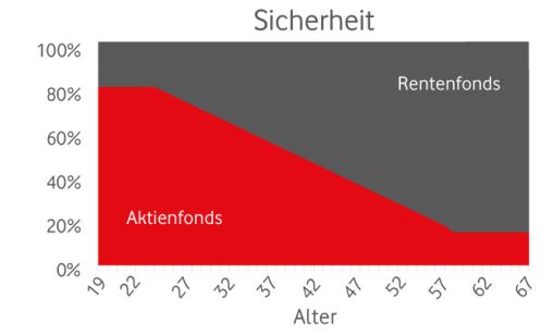 Deine Anlagestrategie, mit der du dich für Wachstum, Balance oder Sicherheit entscheidest, und das jeweilige hinter diesen Anlagestrategien stehende Life-Cycle-Modell. Dieses legt genau fest, in welchem Alter die beiden Dachfonds wie gewichtet werden. Das Prinzip: Je jünger du bist, desto höher der Anteil des wachstumsorientierten Vodafone Aktienfonds. Mit jedem Lebensjahr steigt dann der Anteil des sichereren Vodafone Rentenfonds.
